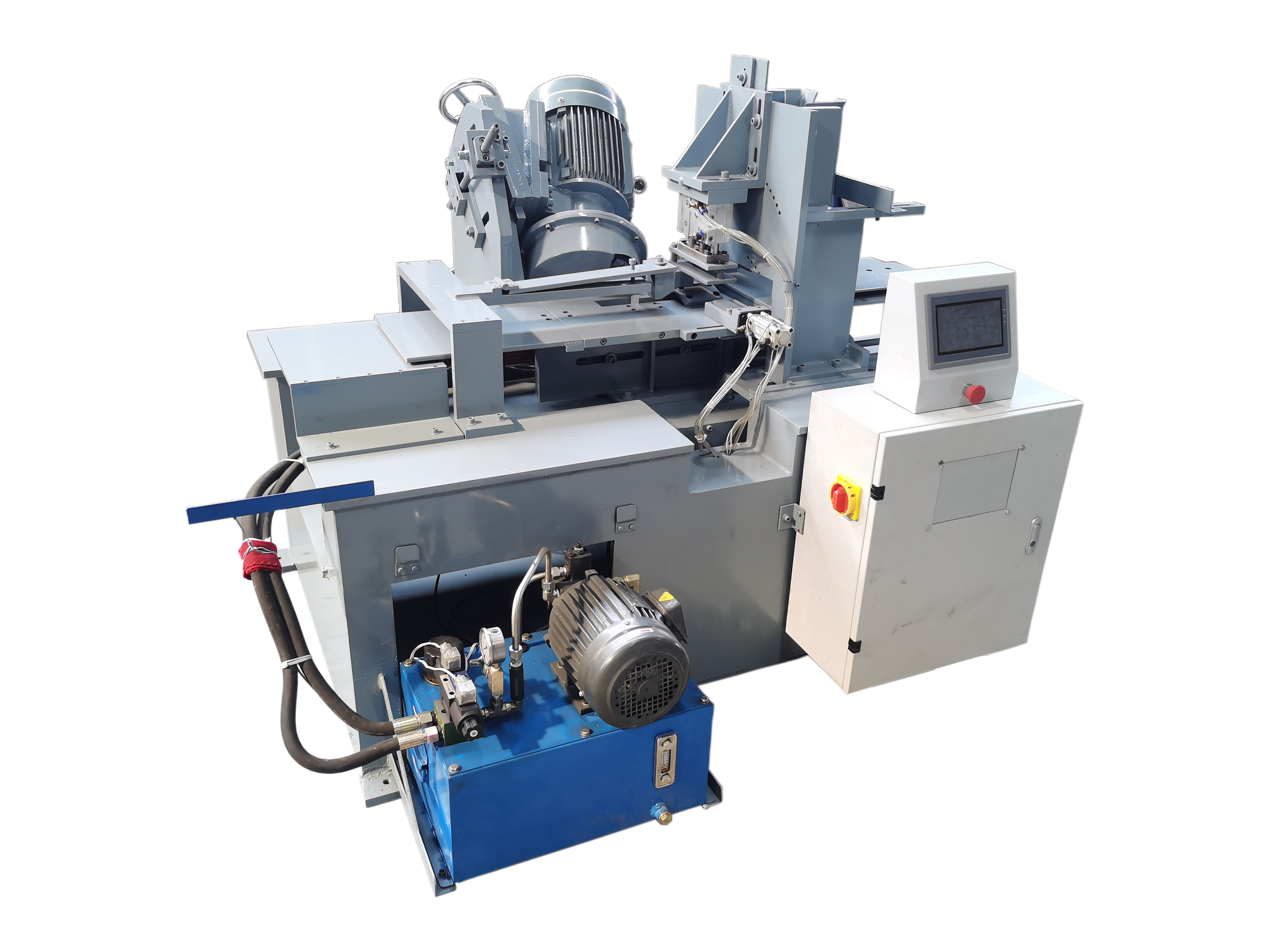 本機主要由機架、模具部件、進給滑臺、砂輪主動力部件、送料料倉、電氣液壓系統、防塵及安全防護裝置等組成。各部件底座由螺栓與床身固定,料倉位于床身右方,砂輪電機部件位于后方,可手動調整電機底座絲杠來控制砂輪磨削角度和深度;產品由伺服電機帶動滑臺動作,使推板推動剎車片滑入模具上,經預定位裝置和壓緊裝置定位壓緊后,通過砂輪進行磨削,然后壓緊裝置松開,滑臺退回帶動剎車片落入接片平臺,磨削完成。